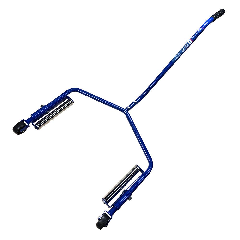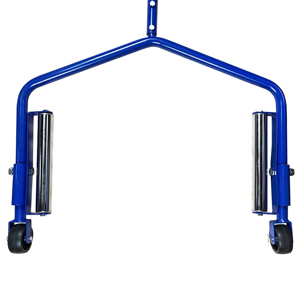 Мощная тележка выдерживает вес до 67.5 кг и представляет собой металлическую раму на двух колесиках. Опорные части конструкции оснащены роликами, что позволяет вращать и позиционировать колесо.