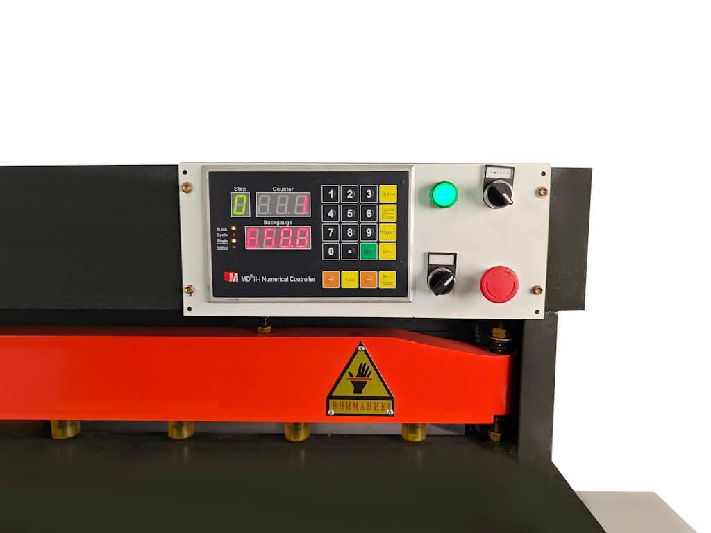 Управление перемещением заднего упора осуществляется числовым контроллером MD11-1. Данный контроллер обладает интуитивно понятным интерфейсом, также на панели контроллера расположен тумблер включения-выключения, световой индикатор питания и грибок аварийного выключения.