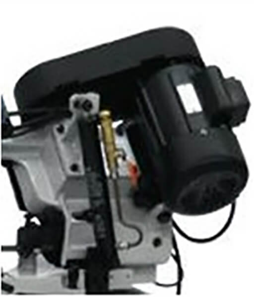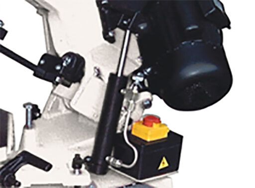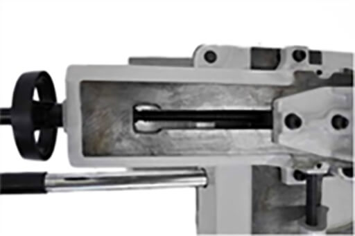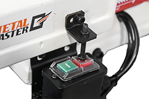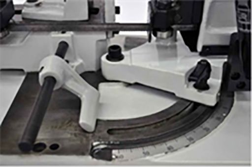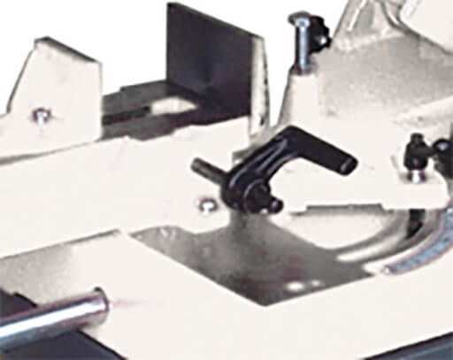 Metal Master BSM 100 имеет возможность поворота пильной рамы на угол 90° ;60° ; 45° Рама отлита из серого чугуна, что позволяет обеспечить необходимую жесткость конструкции и гасить вибрации, возникающие при работе станка. Чтобы повернуть раму необходимо для начала ослабить данный рычаг.