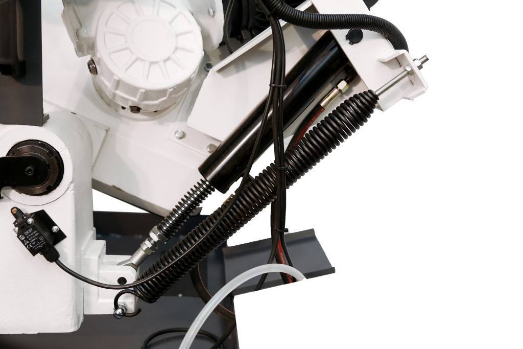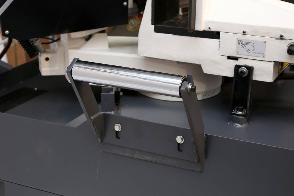 Натяжение пилы осуществляется маховиком по тензометру, что позволяет контролировать натяжение полотна и тем самым получать стабильный рез и продлить срок службы полотна.