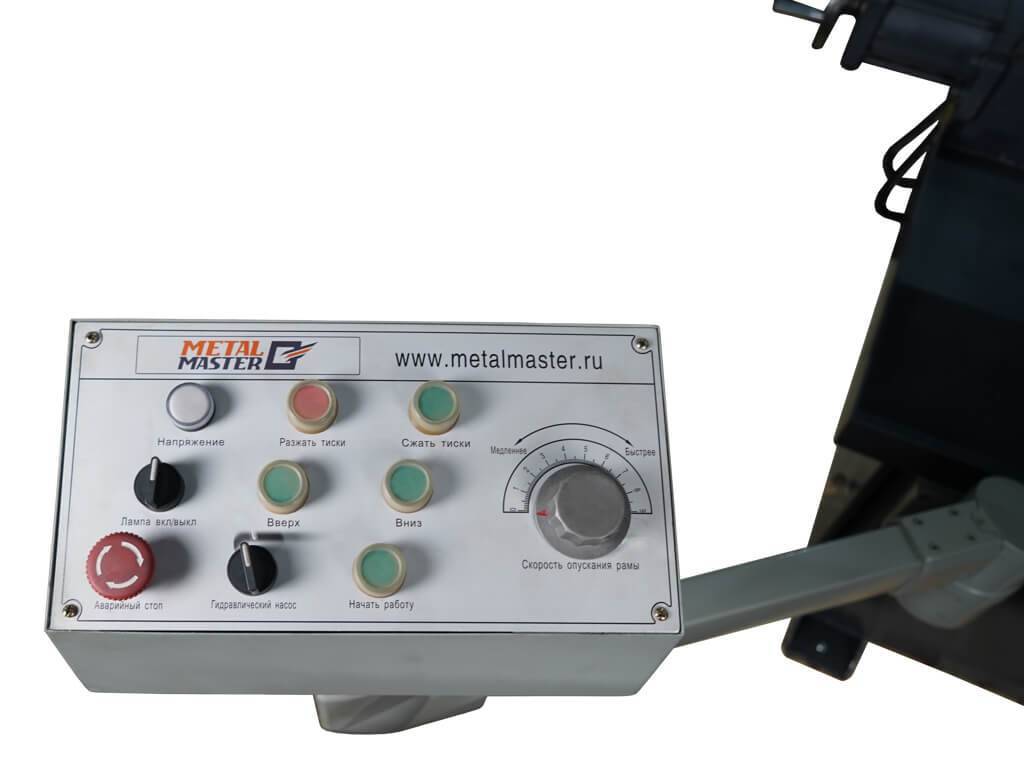 На панели управления располагаются механические кнопки управления станком, а также маховик регулировки скорости опускания пильной рамы.