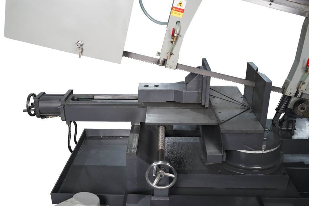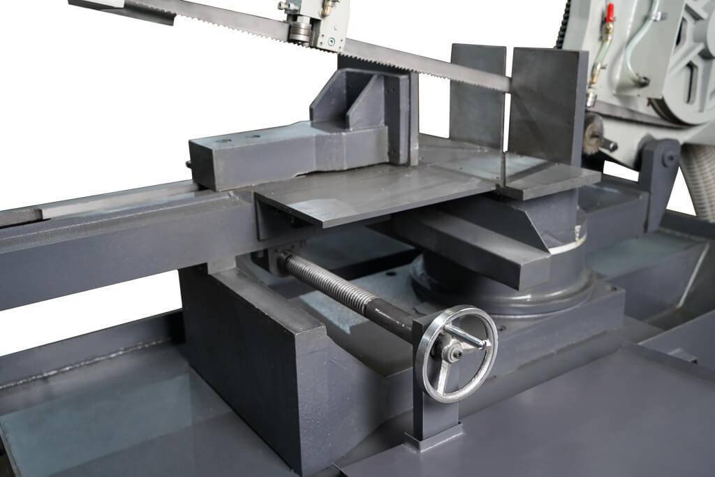 За надежное закрепление заготовки на станке отвечают ручные механические тиски с гидравлическим поджимом. Зажимная губка тисков имеет возможность перемещения по оси Y с помощью вращения маховика, данная функция используется для резки заготовок под отрицательным углом.
