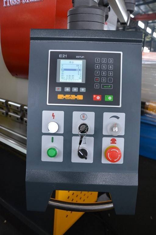 Сбоку от листогиба на поворотном кронштейне расположена панель управления. С панели управления можно задать глубину погружения ножа в матрицу (угол гиба) и перемещать ограничители подачи листа на нужную позицию. Также на панели упрвления расположен переключатель режима работы (толчковый/непрерывный) и таймер установки времени задержки ножа в нижней точке. Панель управления снабжена цифровым индикатором E21 (Estun), на котором отображаются положение ограничителя подачи листа и положение гибочного ножа.