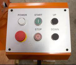 Стойка управления с двумя ножными педалями и кнопкой аварийной остановки, снабжена удобной ручкой для переноски.