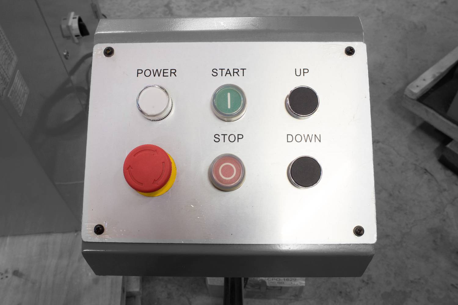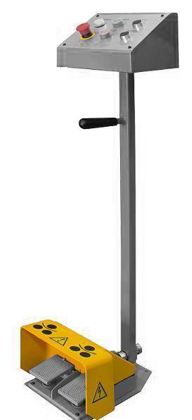 Стойка управления с двумя ножными педалями и кнопкой аварийной остановки, снабжена удобной ручкой для переноски.